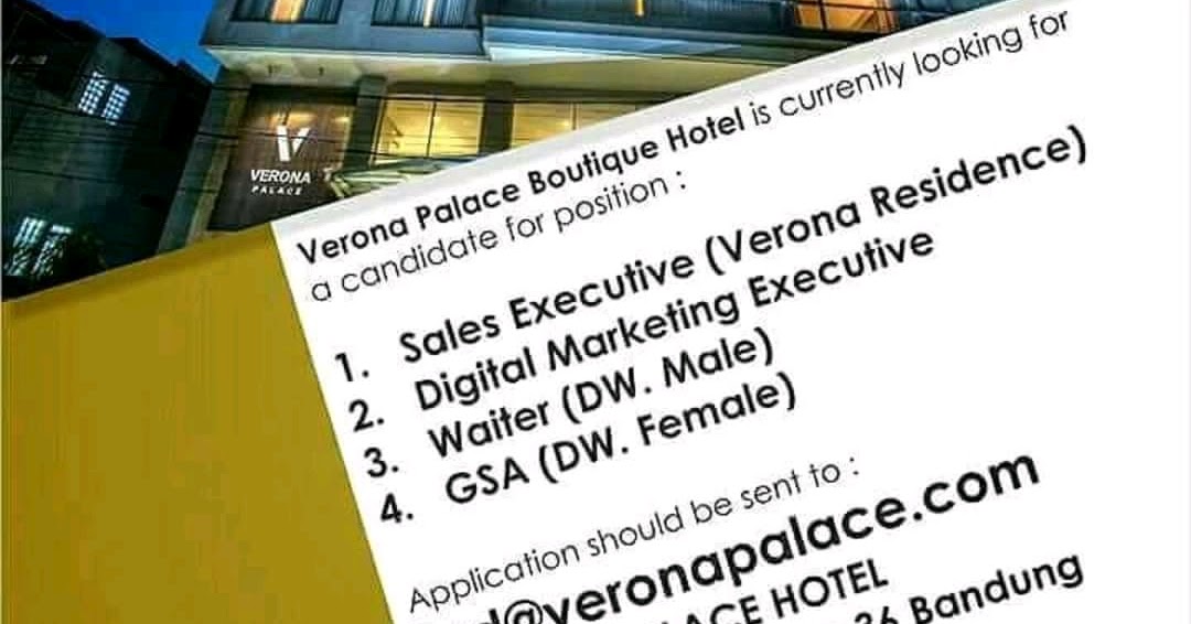Lowongan Kerja Suhi Tei Bandung Maret 2019 - Info Lowongan .... Anda bisa dengan mudah mencari lowongan hotel sesuai dengan kategori yang diinginkan. Kerja di bandung cari di antara 14.100+ lowongan kerja terbaru pekerjaan penuh waktu, sementara dan paruh waktu gaji yang layak langganan informasi lowongan kerja cepat & gratis pemberi kerja terbaik di bandung temukan kerja impian sekarang! Lowongan kerja grandkemang jakarta (4 posisi). Terletak di pusat bogor, indonesia, di depan istana kepresidenan dan tidak jauh dari kebun raya bogor yang terkenal. Sitorusp october 04, 2019 1 comments. Lowongan kerja dinas perhubungan (dishub) kota bandung terbaru 2019. Hotel dafam adalah salah satu grup jaringan hotel terkemuka saat ini telah memiliki beberapa cabang yang berada di cilacap, pekalongan, bandung, kebumen saat ini hotel dafam sedang membuka lowongan kerja terbaru dalam rangka mencari calon. Lowongan hotel jakarta, dapatkan info lowongan kerja hotel di jakarta terbaru dan lowongan resort, villa, restoran di jakarta terbaru. Dibutuhkan segera tenaga kerja untuk mengisi pos… Vinotel cirebon adalah sebuah budget hotel yg berkembang di pusat kota cirebon, membuka kesempatan untuk bergabung dengan tim kami persyaratan: Info lowongan kerja terbaru di hotel dan berbagai lowongan kerja dari berbagai perusahaan dengan banyak posisi yang didapatkan dari sumber terpercaya. Pria di bawah usia 30 tahun memiliki pengalaman di bidang perhotelan minimal 2 tahun memahami proses kerja front office memiliki. Lowongan kerja hotel di web ini kami susun berdasarkan beberapa kategori yaitu department, location dan position. Selalu perhatikan tanggal posting dan batas akhir pengiriman resume. Lowongan kerja tahun 2020 lowongan kerja sma smk d3 s1 loker terbaru semua jurusan lowongan bank lowongan bumn lowongan cpns lowongan pekerjaan tahun 2020.