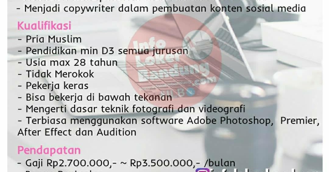 Lowongan Kerja Max Creative Solution Bandung Juli 2020 .... Pada saat ini ini indonesia bahkan dunia dilanda pandemi covid 19 tas yang membuat banyak perusahaan merumahkan karyawan dan lakukan phk terhadap karyawannya demi menyelamatkan keuangan perusahaan yang semakin. Lowongan kerja pt myfood indonesia tahun 2020. Paling lambat tanggal 24 juli 2020. Bisa jadi anda yang kami cari ? Kabar baik gengs, program magang bina bni hadir kembali, kuy ah. Lowongan kerja bandung agustus 2020 pt. Apa lagi jika perusahaan yang kita impikaan merupakan salah satu perusahaan bonafit, tentu akan banyak persaingan untuk bisa masuk keperusahaan tersebut. Ada banyak perusahaan yang membuka lowongan kerja di bulan juli ini dari sumber yang valid, baik hrdnya langsung, sosial media rseminya perusahaan, atau dari situs. Halo pencaker, jne bandung saat ini kembali membuka lowongan kerja terbaru untuk posisi lainnya setelah sebelumnya membuka juga posisi untuk kurir, ini telah saya share dalam postingan sebelumnya. Berikut rangkuman lowongan kerja update sma smk bank & loker bumn bulan juli 2020, silahkan cek sekarang 👆. Lowongan kerja pt agrinusa jaya santosa (japfa gro. (gds) didirikan pada tahun 1989 di surabaya. Lowongankerja15.com, lowongan kerja sma smk bulan juli 2020. Hanya pelamar yang memenuhi persyaratan dan berdomisili di area penempatan dan sekitarnya yang akan. Pt gunawan dianjaya steel, tbk.