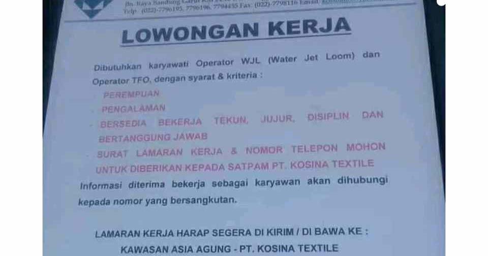 Lowongan Kerja Pabrik Rancaekek di PT Kosina Textile ... . Lowongan kerja pt cs2 pola sehat (orang tua group).